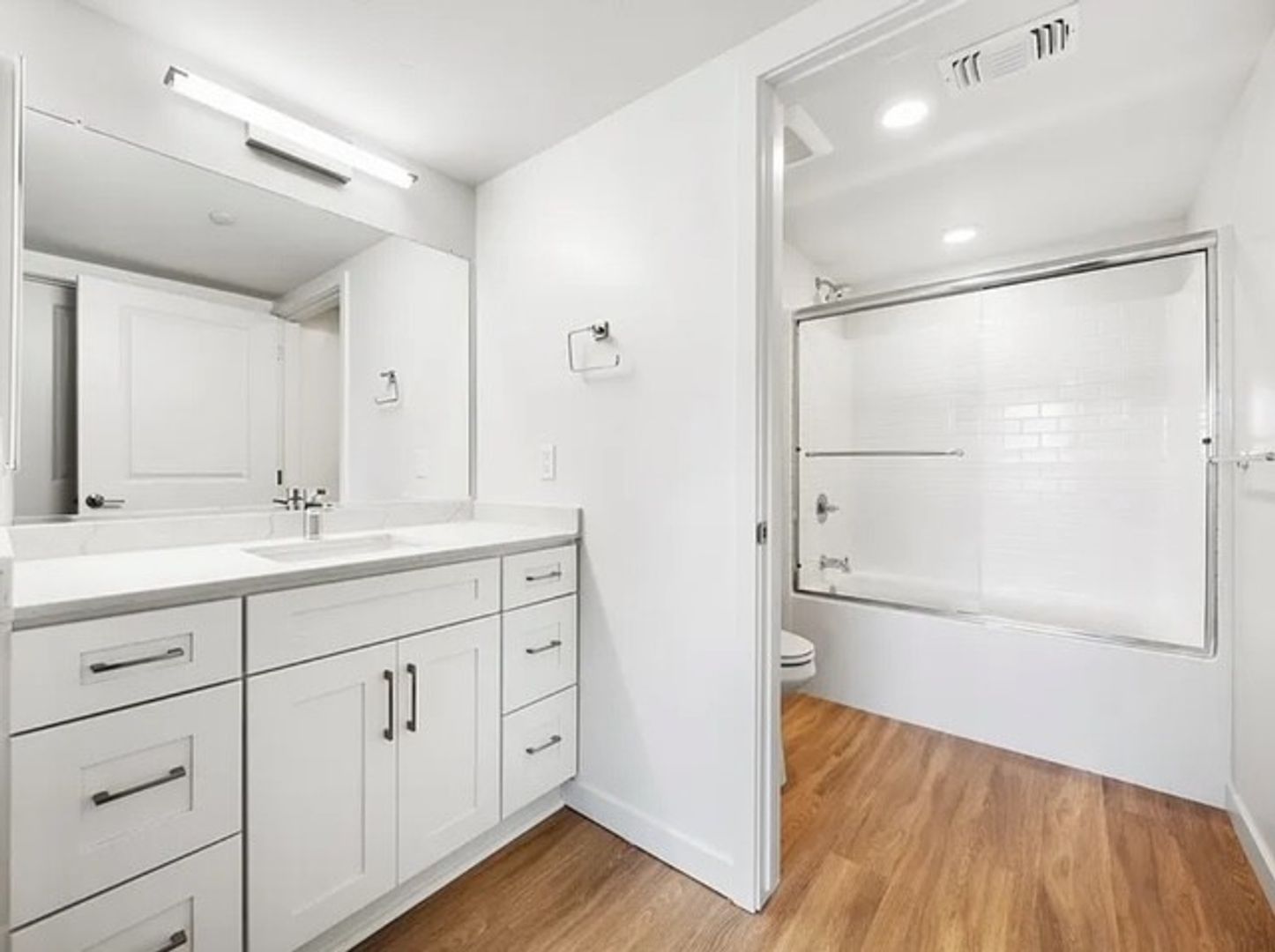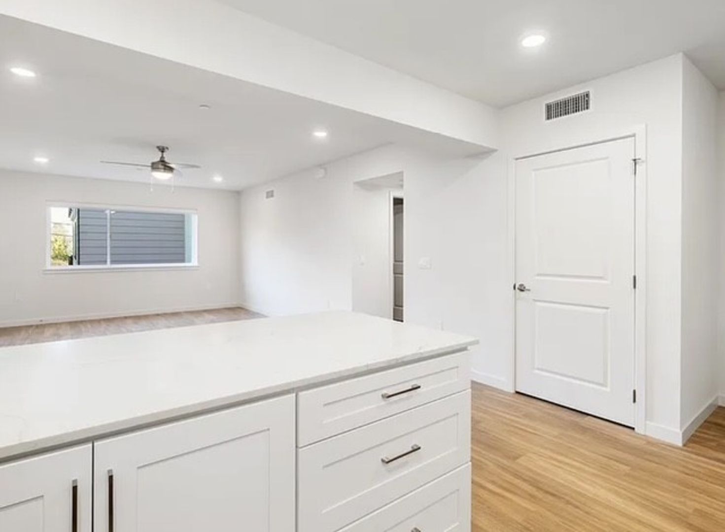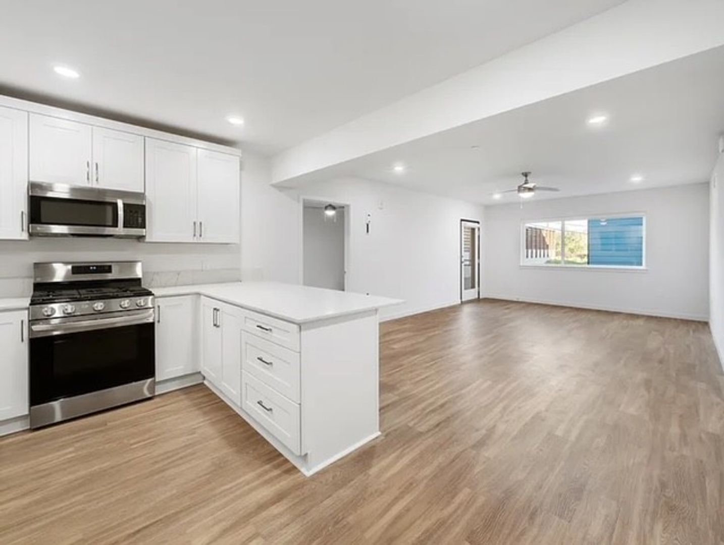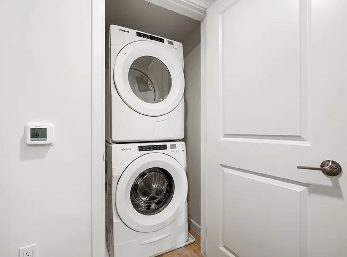Modern living, with open concept, modern style cabinets, quarts countertops, stainless steel appliance and Maytag washer and dryer in units. Entry lock via smart phone or key fob.